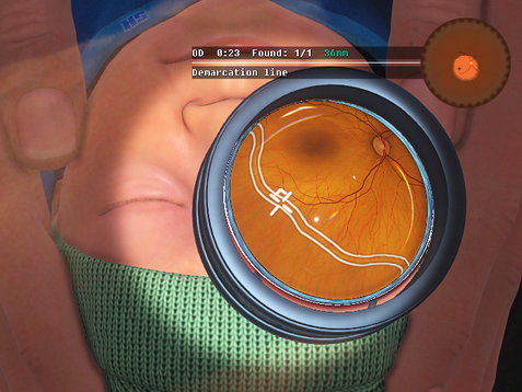 Course A2 provides an introduction into the correct handling of the scleral depressor, which can be useful when examining the retinal periphery. As trainees work through the tasks, they are challenged to find objects that are spread across the entire retina, up to the ora serrata. This enables trainees to orient themselves in the retina in line with the anatomical zones described in the third edition of the International Classification of ROP (ICROP3).